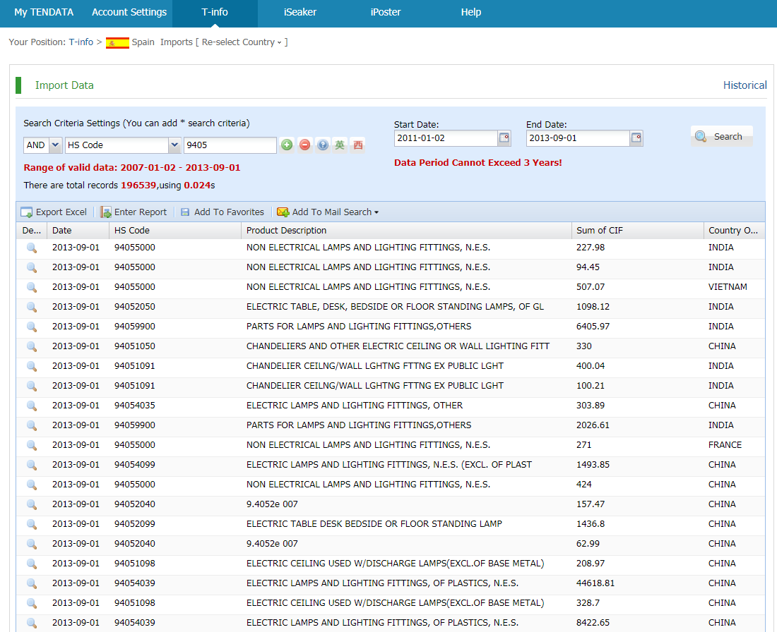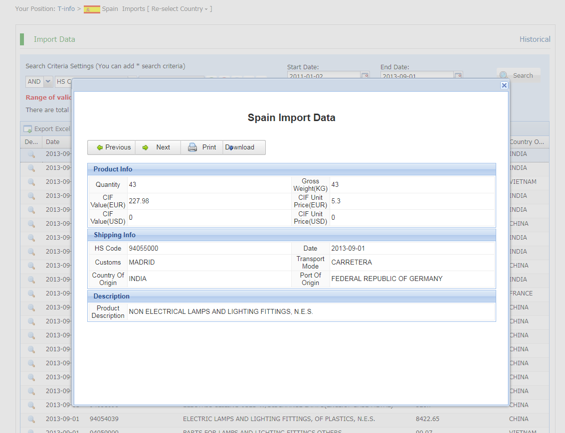 Spain import and export data actually provided by government customs, Filter by products, shipment dates, ports, country of origin,quantity,price and more.