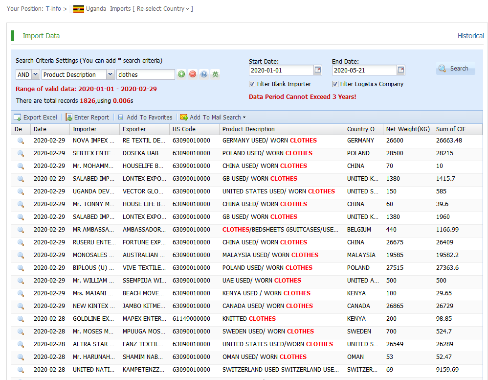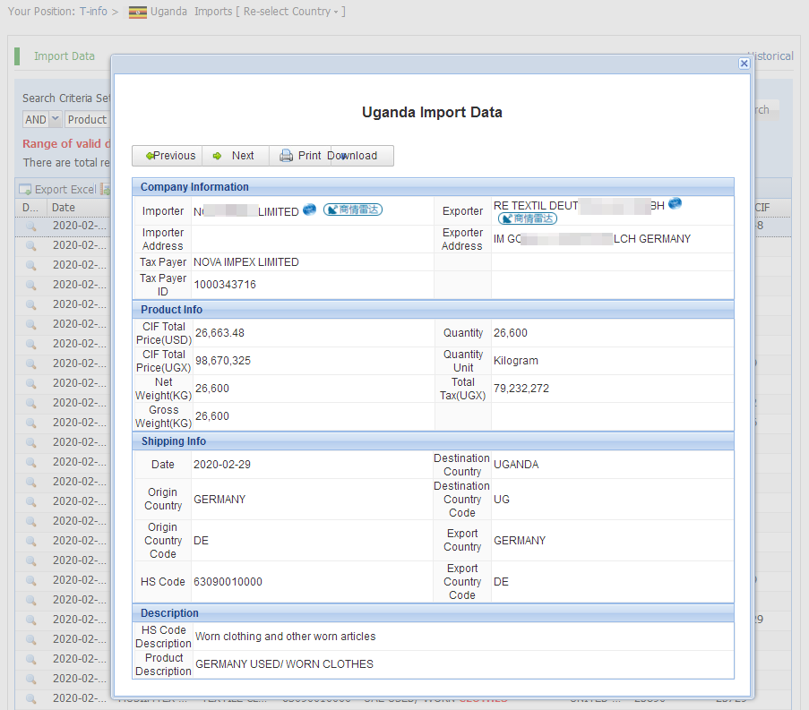Uganda import and export data actually provided by government customs, Filter by products, shipment dates, ports, country of origin,quantity,price and more.